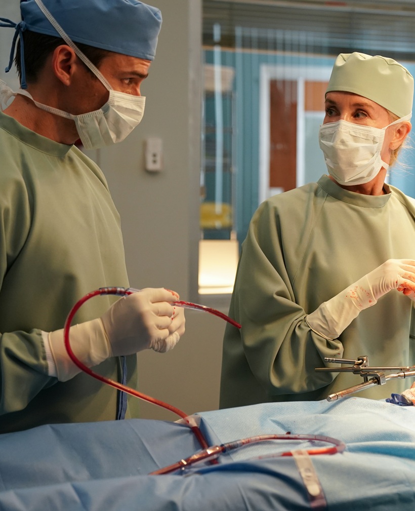 Joan signals him for a discussion. She expresses her disappointment in him for not coming directly to her first. She’ll perform the surgery herself.