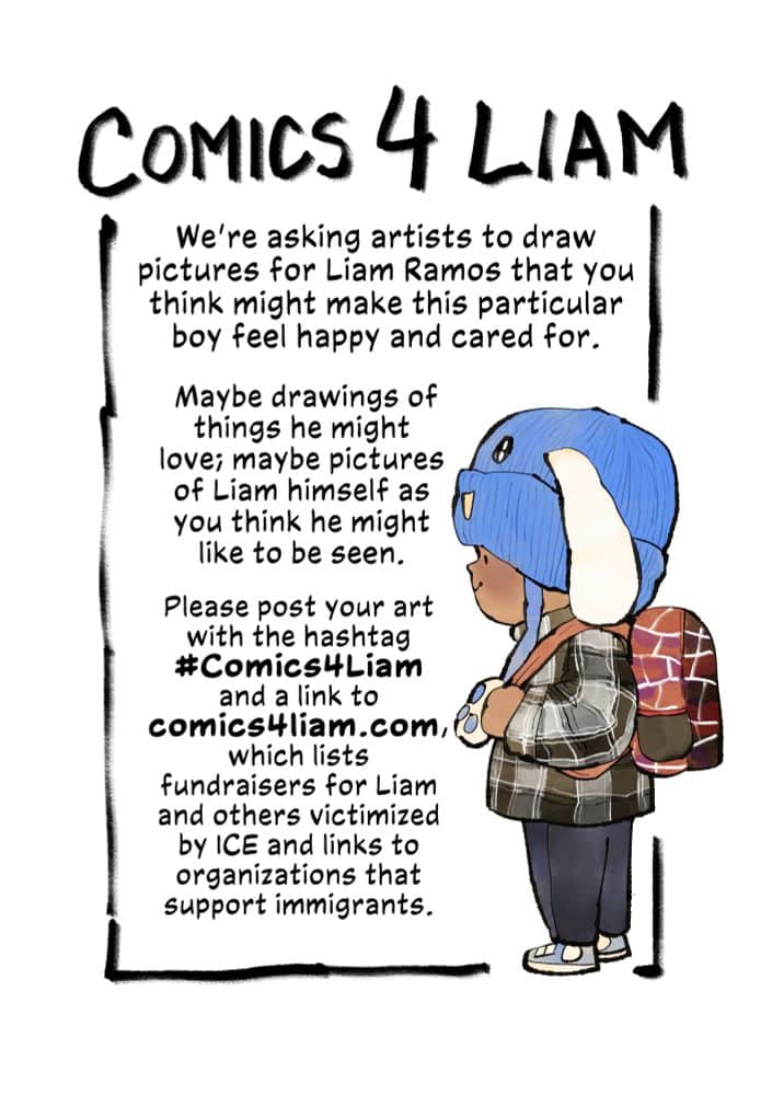 Friends, we’re thrilled to announce #Comics4Liam to encourage artists to draw pictures for Liam Conejo Ramos and share links to help Liam’s family and other immigrants persecuted by ICE! Check out comics4liam.com and please do feel free to pitch in! Images by the great @trungles.com!